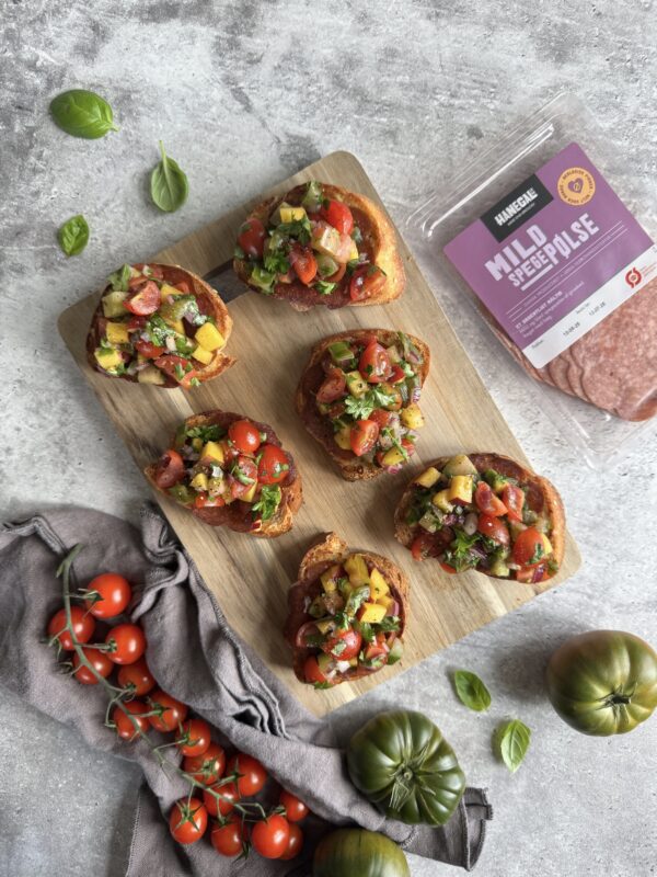 BRUSCHETTA M. TOMAT, NEKTARIN & MILD SPEGEPØLSE