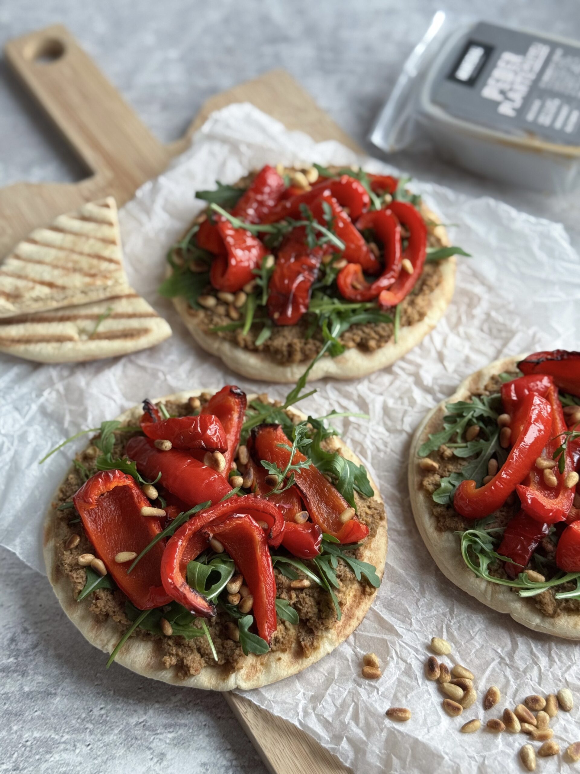 Forkæl dig selv med disse grillede pitabrød, smurt med vores nye økologiske peberplantepostej, toppet med rucola, bagt peberfrugt og ristede sprøde pinjekerner. En plantegal frokost fuld af smag 😋🌱