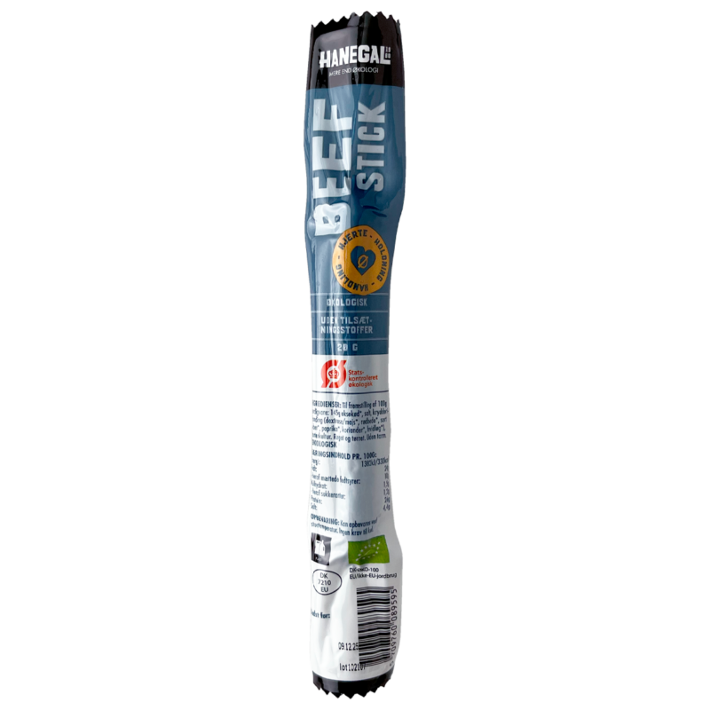 Hanegal Snackpølse af oksekød – Økologisk snack i praktisk størrelse. Nyd Hanegals økologiske snackpølse lavet af oksekød, mildt krydret med paprika, koriander og peber for en afrundet og velsmagende smag. Røget over bøgeflis, hvilket giver en let og delikat røgsmag. Den enkeltvis indpakkede snackpølse er perfekt som hurtig snack på farten, i madpakken eller som en lækker lille bid til tapas og salater derhjemme. Et økologisk og praktisk valg til hele familien.