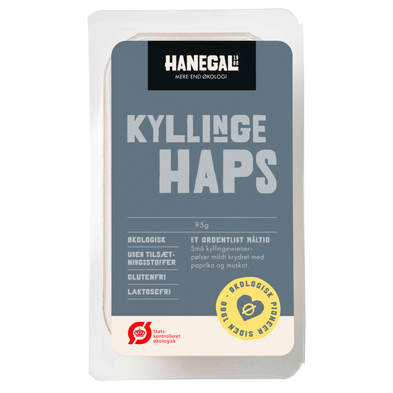 Hanegal Kyllingehaps – Små, saftige og økologiske kyllingepølser med en mild og rund smag. Krydrede med sød paprika, muskat og løg, som gør dem velegnede til både børn og voksne. Perfekte som en del af varme retter eller stegte på brunchbordet. Praktiske i størrelsen og nemme at tilberede.