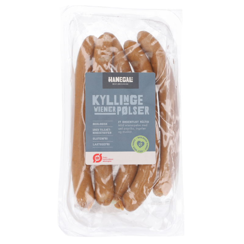 Hanegal Kyllingewienerpølser – Delikate kyllingepølser med mild og børnevenlig smag. Krydrede med sød paprika, muskat og løg for en rund og blød smagsoplevelse, der passer perfekt til hotdogs, gryderetter og i varme retter, hvor en mild og velsmagende pølse er ønsket. Pølserne er nemme at tilberede til et hurtigt og velsmagende måltid, som hele familien kan nyde. Økologiske og uden tilsætningsstoffer.