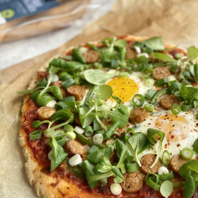 Ingredienser: 63% kyllingekød med skind*, 17% hønsekød*, vand, kartoffelmel*, salt, løg*, paprika*, muskat*, hvidløg*, hvid peber*, sort peber* og ingefær*.