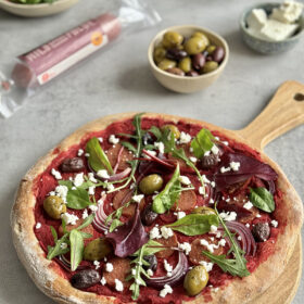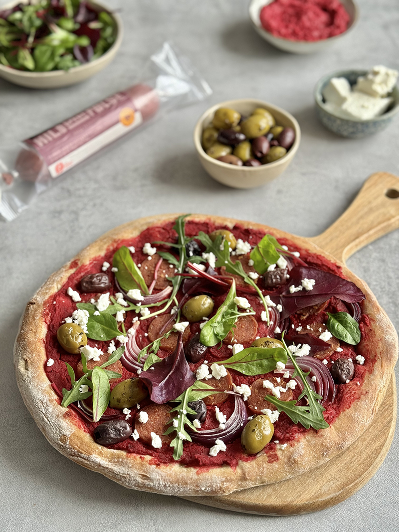 Ingredienser: Til 100 g færdigvare er anvendt 92 g grisekød*, 24 g spæk*, salt, dextrose*, sød paprika*, rødbedepulver*, tomatpulver*, hvid peber*, sort peber*, hvidløgsgranulat* og starterkultur.