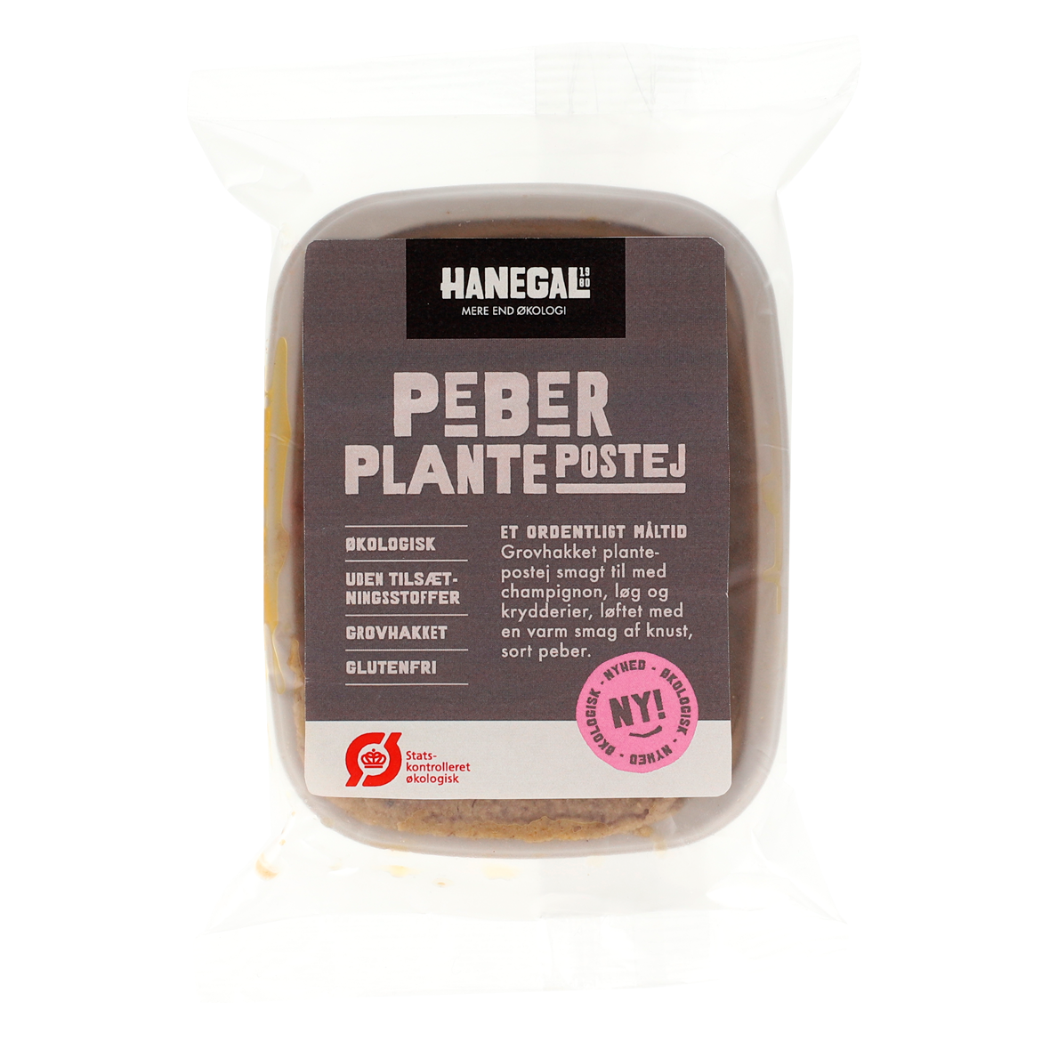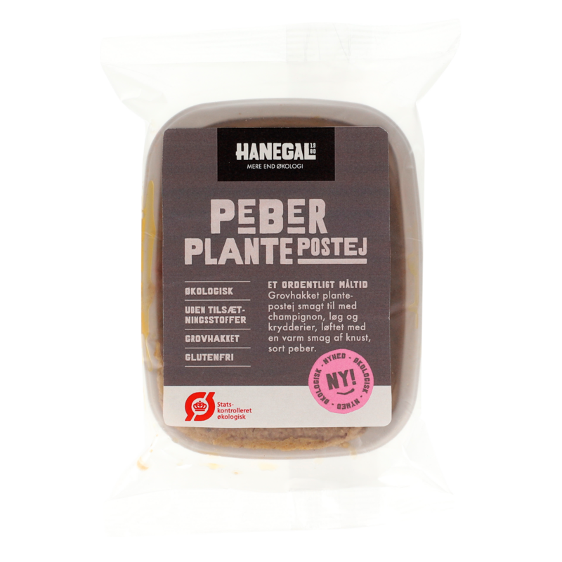 Hanegal Peberplantepostej – Grov, smagfuld og plantebaseret. En økologisk, vegansk plantepostej med grov struktur og tydelig smag, lavet med champignon, løg og klassiske krydderier. Den markante smag af knust sort peber giver både varme og dybde. Perfekt som grønt alternativ på rugbrød, i sandwich eller som del af en grøn frokosttallerken. Et bevidst valg til dig, der ønsker plantebaseret pålæg med kant og smag.