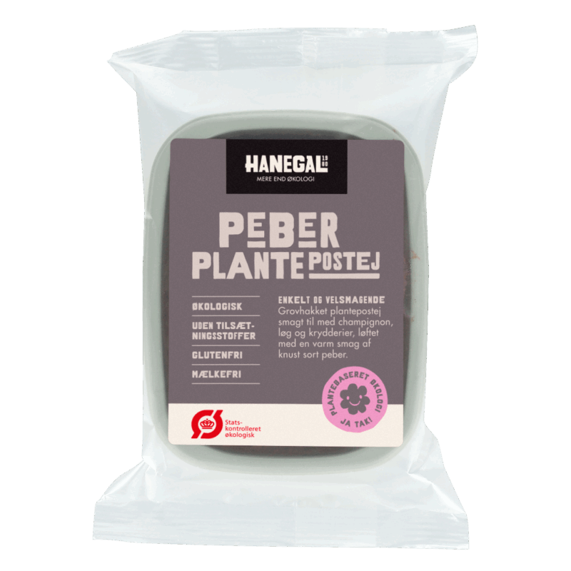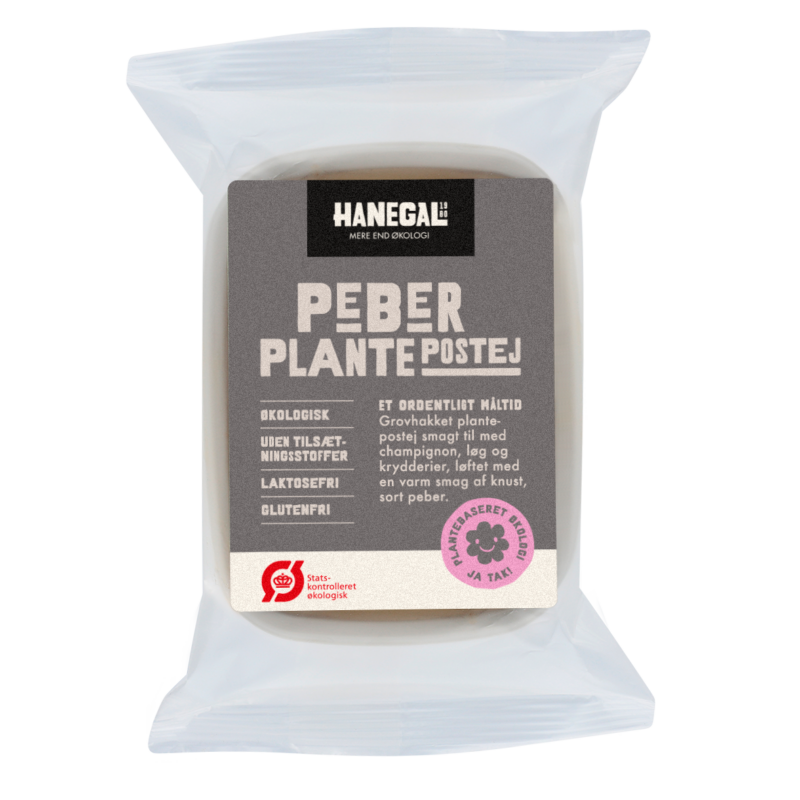 Hanegal Peberplantepostej – Grov, smagfuld og plantebaseret. En økologisk, vegansk plantepostej med grov struktur og tydelig smag, lavet med champignon, løg og klassiske krydderier. Den markante smag af knust sort peber giver både varme og dybde. Perfekt som grønt alternativ på rugbrød, i sandwich eller som del af en grøn frokosttallerken. Et bevidst valg til dig, der ønsker plantebaseret pålæg med kant og smag.